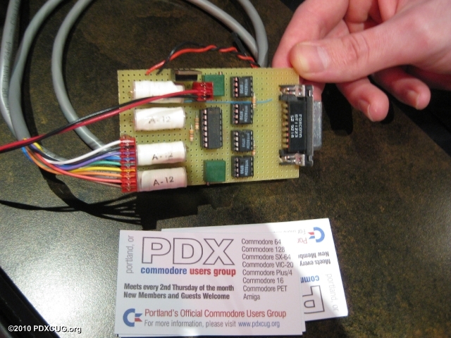 Member Dan brought his long-lost analog joystick interface. It allows a modern PC joystick to plug into a stock Commodore joystick port. The PC joystick plugs into one side and the other side feeds into the Commodore joystick port. He designed it in the 1990s (his own design) so that he could use his Gravis gamepad with his Atari and Vic-20.