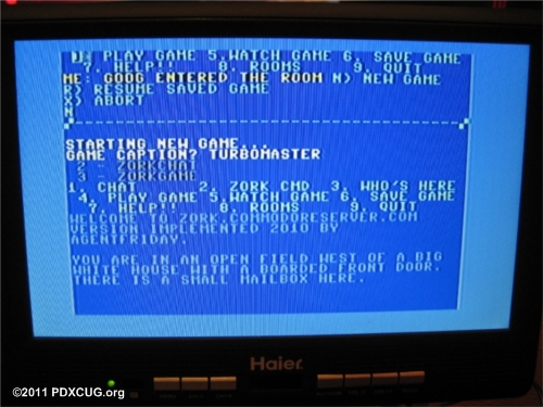 Agent Friday showed his pre-release of Group Zork. Group Zork is an online, multi-player game which uses CommodoreServer's new gaming service. Players can play their own game of Zork while others can watch and make suggestions along the way, just like in the old days when you played and had your friends in the same room looking over your shoulder. Players can chat with each other in the game at the same time the game is being played. This game was originally conceived at our May 2010 Meeting and is nearly a reality - Agent Friday will be releasing it into BETA in the next few days.