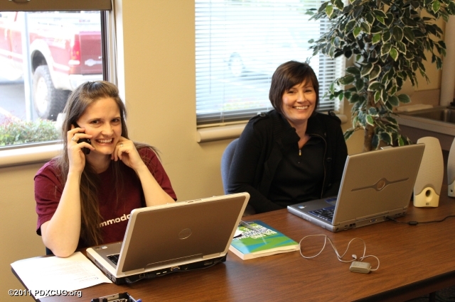 Meet a couple of our chat operators. These are the fun-loving gals that make our interactive meetings so much fun. As you can see, we have the chat session showing up on the room's monitor so that everyone can see what's happening in chat during the meeting. Come say hi to us during the evening - you'll have fun interacting with them, our members and others from around the world.