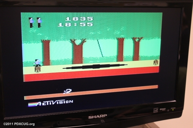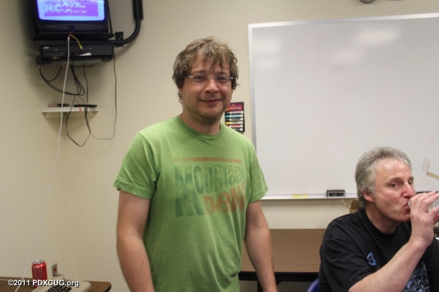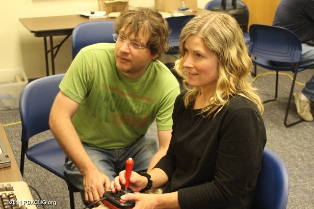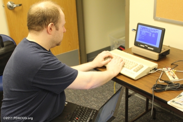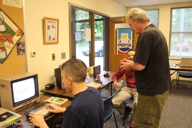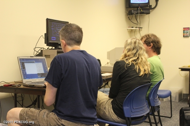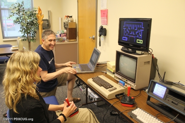 Members Earl, Miru, Kris, and Jeff enjoying a little gaming time, playing various games on the Commodore 64.