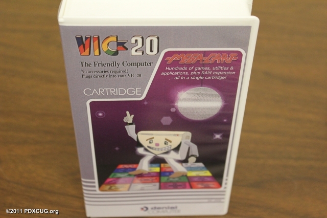 A Vic-20 fan yielding a Vic-20 button, along with the usual Mega-Cart cartridge on-hand to play some games.