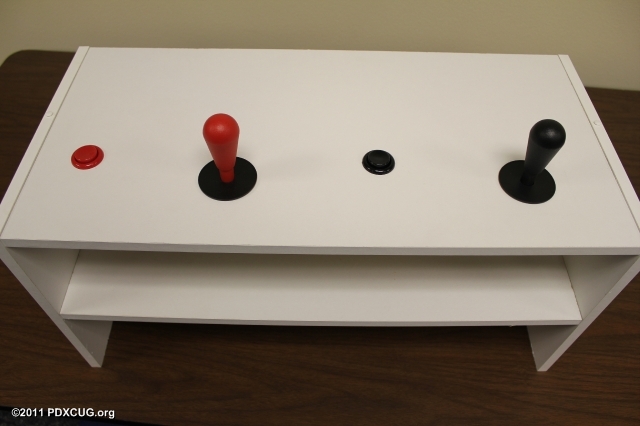 This thing is really cool - Jeff made it to be used as an arcade-style joystick for the Commodore 64. Rather than constructing it with a new design, he used an off-the-shelf shelf. Makes for some good two-player shoot-em-ups.