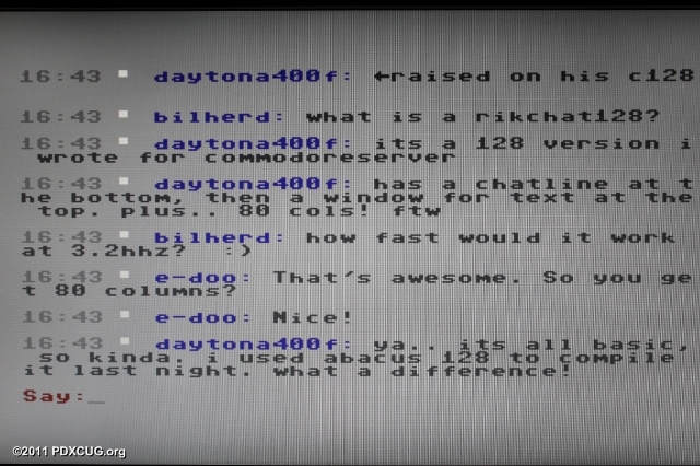 Also rather neat was Daytona had a BETA version of RikChat128 (as you can see in the chat log). It is an 80-column chat program for use with the Comet64 Internet Modem on the Commodore 128 or VICE 128.